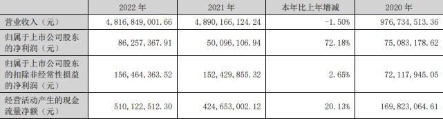 据香山股份2022年年报,报告期内,公司实现营业收入48.17亿元,同比减少1.50%;归属于上市公司股东的净利润8625.74万元,同比增长72.18%;归属于上市公司股东的扣除非经常性损益的净利润1.56亿元,同比增长2.65%;经营活动产生的现金流量净额5.10亿元,同比增长20.13%。
