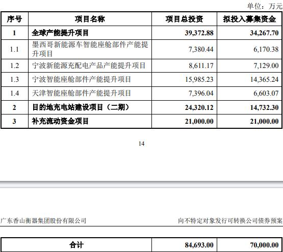 本次发行可转换公司债券的募集资金总额不超过70,000.00万元(含本数),扣除发行费用后,募集资金净额将投资于全球产能提升项目(含墨西哥新能源车智能座舱部件产能提升项目、宁波新能源充配电产品产能提升项目、宁波智能座舱部件产能提升项目、天津智能座舱部件产能提升项目)、目的地充电站建设项目(二期)、补充流动资金项目。