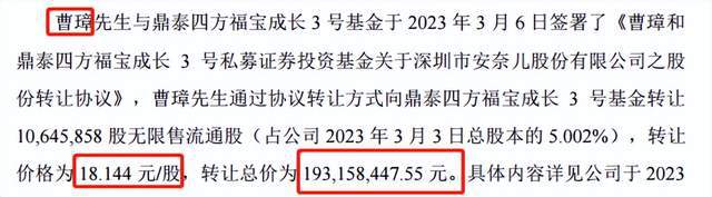 3月6日,曹璋与鼎泰四方福宝成长3号基金签署了股份转让协议,曹璋通过协议转让方式向鼎泰四方福宝成长3号基金转让1064.59万股(占公司3月3日总股本的5.002%),转让价格为18.144元/股,转让总价为1.93亿元。