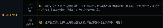 从一系列的回复来看,安奈儿的抗病毒抗菌面料量产了,成衣产品上线了,但产能多少,销量如何,目前还看不到消息,对业绩的影响,还有待观察。