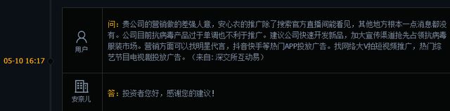 营销上,安奈儿被股民吐槽“贵公司的营销做的差强人意,安心衣的推广除了搜索官方直播间能看见,其他地方根本一点消息都没有。”