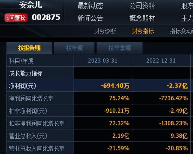 2023年一季度,安奈儿实现营业总收入2.19亿元,同比下降21.59%;归母净利润亏损694.40万元。