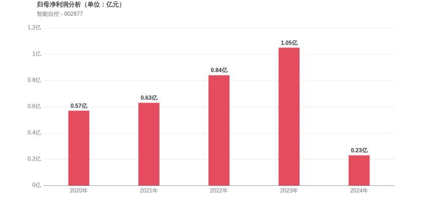 利润角度分析,2020年智能自控实现归母净利润0.57亿元,2024年0.23亿元。公司净利润出现大幅下滑,2024年同比下降78.37%。
