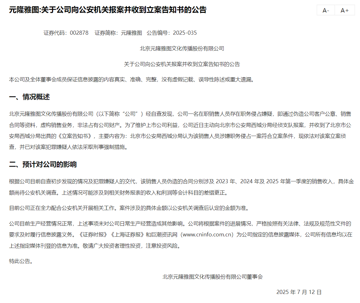 7月11日晚间,元隆雅图公告,经自查发现,公司一名在职销售人员存在职务侵占嫌疑,即通过伪造公司客户公章、销售合同等资料,虚构销售业务,非法占有公司财产。该销售人员伪造的合同分别涉及2023年、2024年及2025年一季度的销售收入。