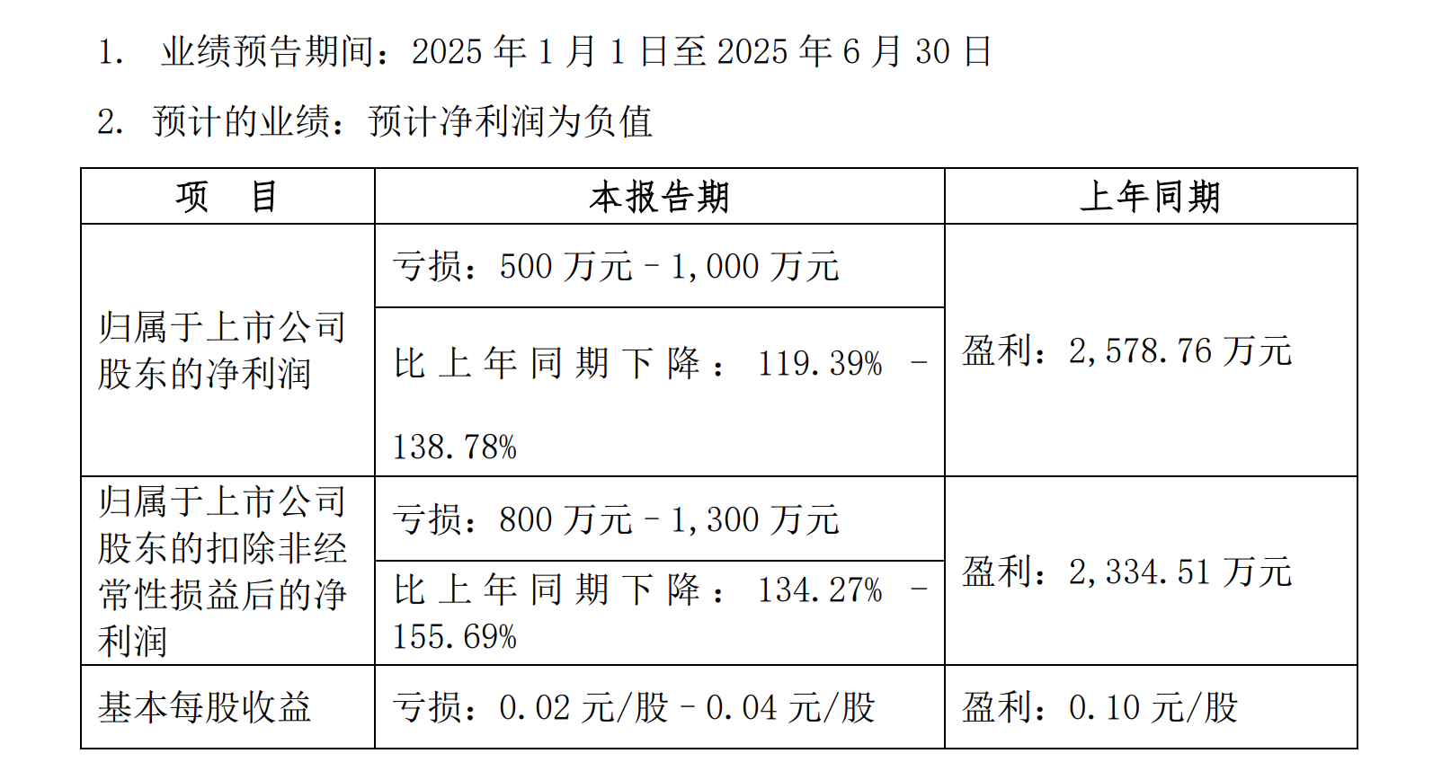 元隆雅图发布的2025年半年度业绩预告显示,该公司预计上半年净利润亏损500万元至1000万元,上年同期盈利2578.76万元;扣非净利润亏损800万元至1300万元,上年同期盈利2334.51万元。