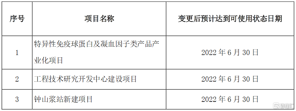 特异性免疫球蛋白及凝血因子类产品产业化项目及工程技术研究开发中心建设项目延期原因为受国家药品审评审批制度改革的影响,研发过程中药学及临床研究技术要求不断提高,必须严格执行审评审批制度流程要求,因此冻干人用狂犬病疫苗(鸡胚细胞)、人凝血酶原复合物、人凝血因子VIII的研发及产业化进程均有不同程度的延期。