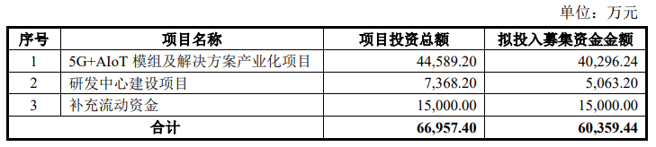 公告显示,5G+AIoT 模组及解决方案产业化项目总投资为 44,589.20 万元,其中工程建设投资 18,236.00万元,包括购置办公场所 16,000.00 万元、场地装修费 1,120.00 万元和工程预备费 1,116 万元;项目设备及软件投资 20,081.24 万元,包括实验室及设备购置、安装 11,986.24 万元、芯片平台及信息系统建设 8,095.00 万元;项目产品研发费用 4,739.96 万元,包括研发人员费用 3,095.00 万元、研发产品认证费用 1,644.96万元;铺底流动资金 1,532.00 万元。
