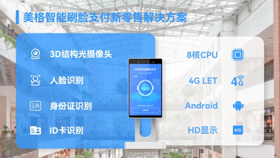 刷脸支付以智能化的支付和结算,提高了购物的便利性和效率。美格智能刷脸支付解决方案基于散斑结构光原理设计,采用高性能8核CPU,支持4G/5G、网线宽带和Wi-Fi接入。高清智能小型化超薄3D结构光摄像头能够快速准确获取目标的深度信息,可适用于近距离人脸识别、深度数据采集、立体与平面判断等。
