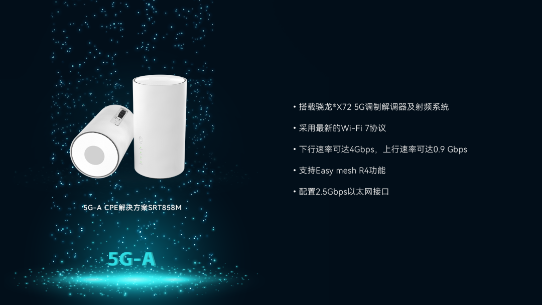 5G-A CPE解决方案SRT858M搭载高通骁龙?X72 5G调制解调器及射频系统,采用最新的Wi-Fi 7协议,带来高速率、低延迟、高稳定、高安全的连接体验,下行速率可达4Gbps,上行速率可达0.9 Gbps。支持Easy mesh R4功能,支持双频并发,设备可在2.4GHz和5GHz频段上同时进行并发通信,从而提供更高的吞吐量和更稳定的连接性能。同时,配置2.5Gbps以太网接口,大幅提升速率,满足多用户、高带宽场景下的高速上网需求。支持RJ11电话接口,应用场景更加多元化。