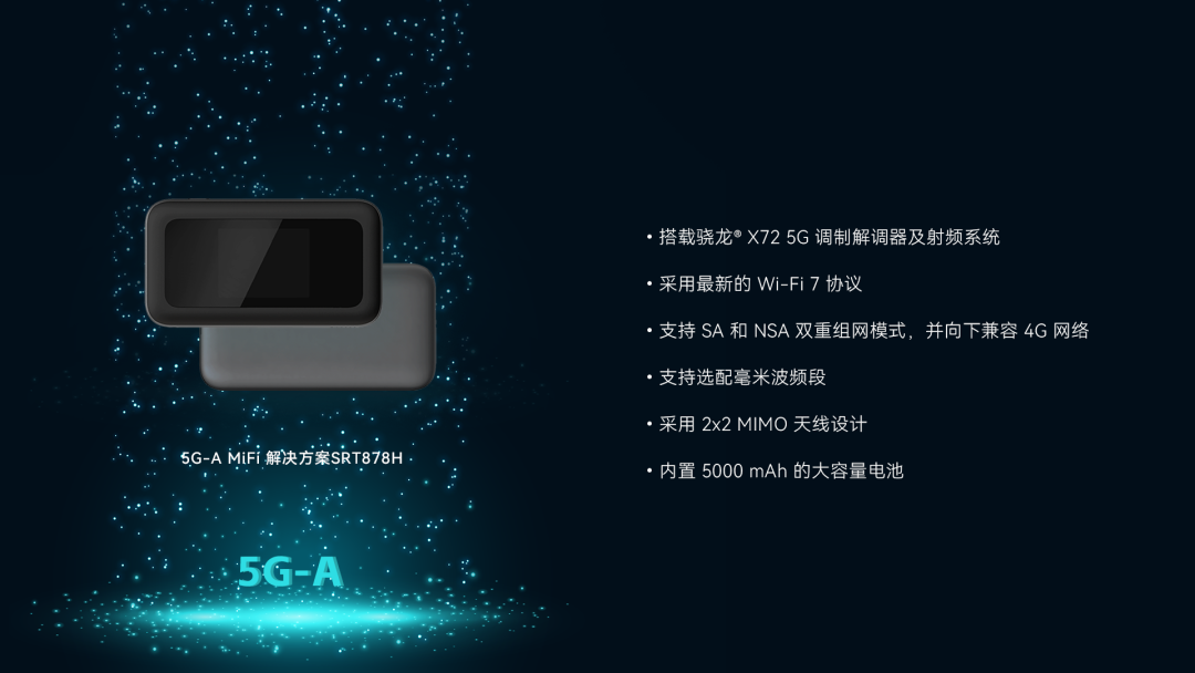 5G-A MiFi解决方案SRT878H将5G网络转化成随身Wi-Fi信号,可为家庭、办公、个人出行等应用场景提供快捷、高速的网络接入。SRT878H依托骁龙X72平台,率先支持最新Wi-Fi 7标准。支持SA和NSA双重组网模式,并向下兼容4G网络,复杂场景下也能轻松使用。