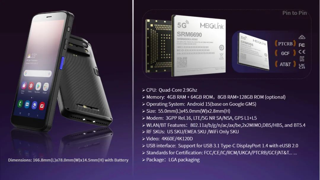 值得一提的是,新一代的SRM6690模组具有丰富的功能扩展接口,可广泛应用于手持设备、售卖机、物流柜、音视频记录仪、智能对讲设备、车载设备、高端信息采集设备、智能机器人、智能家居、智能穿戴等领域,在设计上SRM6690模组与QCM6490平台的SRM955模组兼容。目前,SRM955模组已完成FCC/CE/IC/RCM/UKCA/PTCRB/GCF/AT T认证, SRM6690模组相关认证计划也已提上日程,可以助力客户快速部署和健全对应产品系列的同时,为客户终端产品节约70%至90%的安规和运营商认证费用。