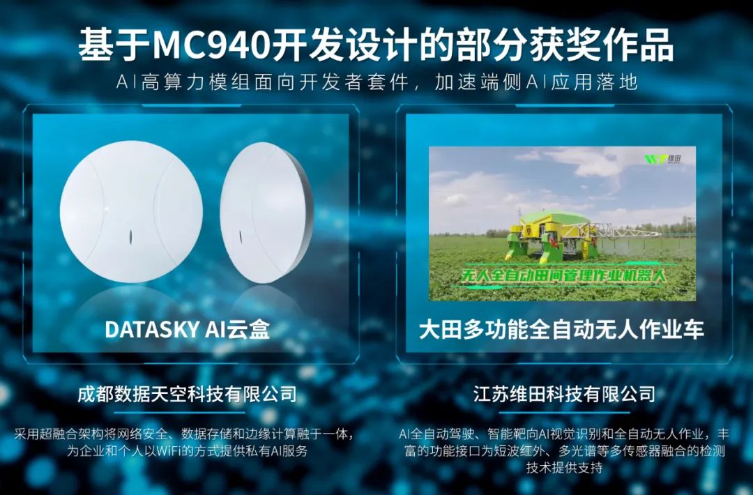本次金奖获奖项目大田多功能全自动无人作业车,便是基于美格智能MC940研发设计,能够基于高算力实现AI全自动驾驶、智能靶向AI视觉识别和全自动无人作业,丰富的功能接口为短波红外、多光谱等多传感器融合的检测技术提供支持。商业奖获奖项目DATASKY AI云盒,同样是基于美格智能MC940平台研发,DATASKY AI云盒是企业级基于边缘计算的生成式AI设备,采用超融合架构将网络安全、数据存储和边缘计算融于一体,为企业和个人以WiFi的方式提供私有AI服务。