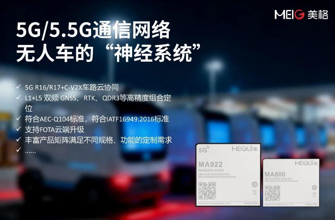 美格智能的5G/5.5G通信模组为无人车提供了可靠的连接基础。早在2022年,美格智能研发的5G高速率模组便助力国内某无人车领军企业亮相上海进博会,同时公司为该客户定制开发的新一代5G智能模组解决方案也已全面量产,加速规模化增长。此外,SRM975、SRM965采用的SIP系统级封装和MA951、MA922以及MA800系列的车规级表现,能够保证无人车产品在反复启停和长时间运行时始终保持稳定、高效地运行和连接。