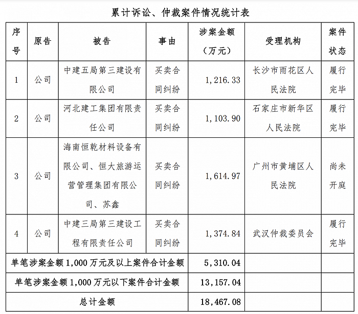 本次公告的诉讼、仲裁事项对公司本期利润或期后利润的可能影响本次公告的诉讼、仲裁案件中,多数为公司或公司控股子公司作为原告要求交易对方支付逾期货款。截至本公告披露日,公司及公司控股子公司已收回全部款项的案件的金额为6,038.59万元。