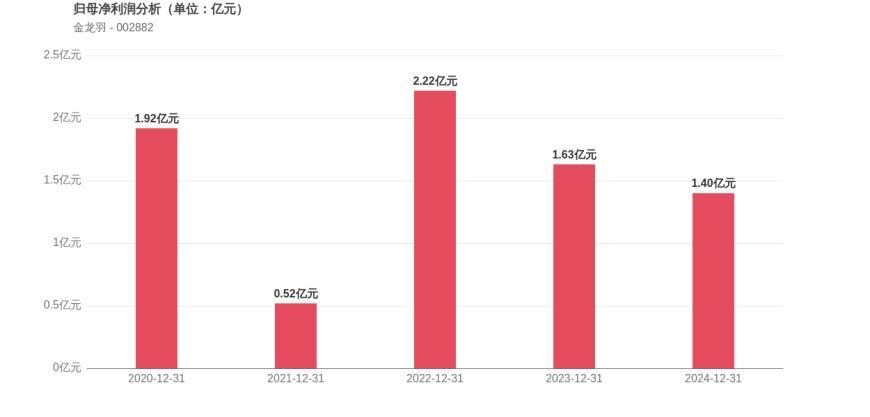 利润角度分析,2020年金龙羽实现归母净利润1.92亿元,2024年1.40亿元。利润表现波动较大,2022年曾出现大幅反弹,但随后两年持续下滑。