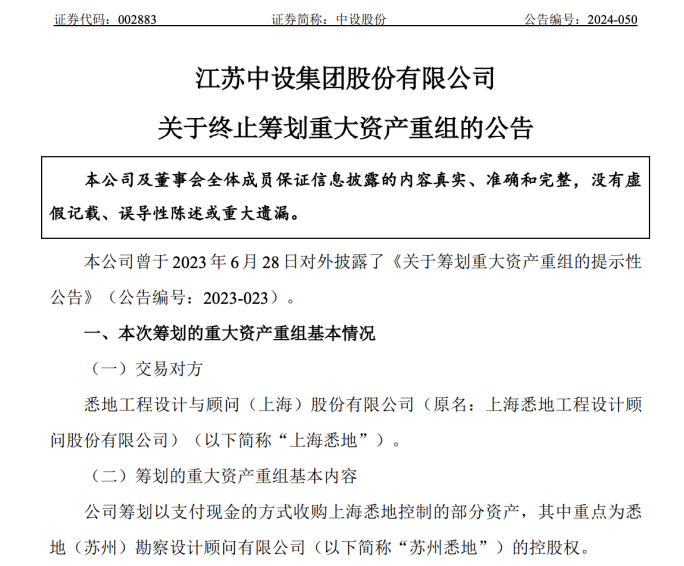 2024年12月27日晚,江苏中设集团股份有限公司(证券简称“中设股份”)发布公告,终止筹划重大资产重组。