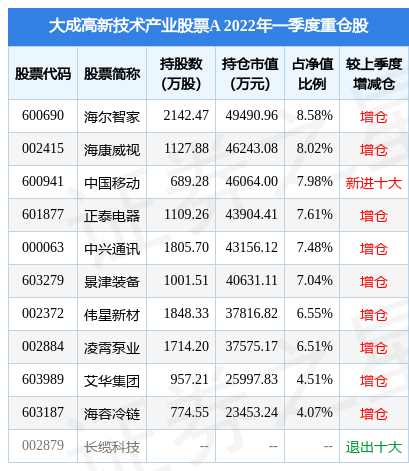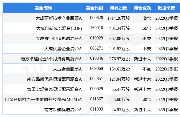 根据2022Q1季报基金重仓股数据,重仓该股的基金共15家,其中持有数量最多的基金为大成高新技术产业股票A。大成高新技术产业股票A目前规模为47.38亿元,最新净值3.271(4月29日),较上一交易日上涨3.81%,近一年下跌0.46%。该基金现任基金经理为刘旭。刘旭在任的公募基金包括:大成优势企业混合A,管理时间为2019年12月24日至今,期间收益率为71.21%;大成睿裕六月持有股票A,管理时间为2020年6月5日至今,期间收益率为16.81%;大成睿鑫股票A,管理时间为2020年8月11日至今,期间收益率为0.48%。