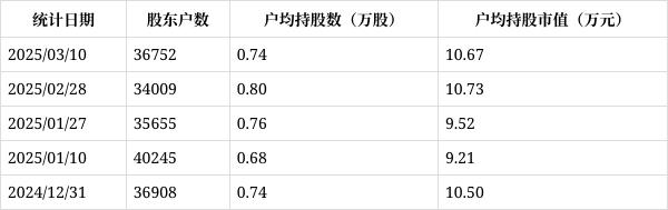 从3月11日公开信息显示,京泉华截至2025年3月10日公司股东户数为3.68万户,较上期(2025年2月28日)增加2743户,增幅为8.07%,持股趋于分散。