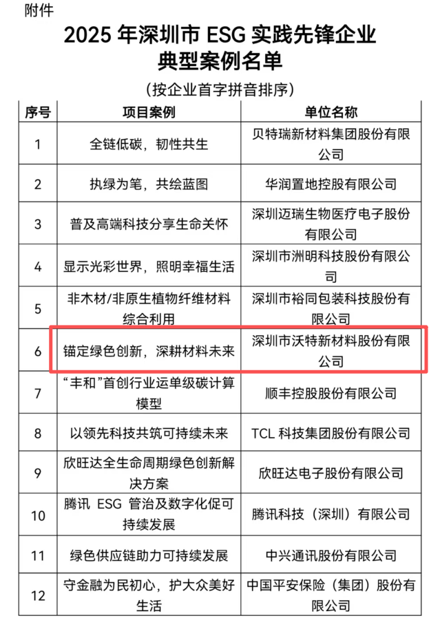 近日,深圳市发展和改革委员会公示了“2025年深圳市ESG实践先锋企业典型案例”名单。沃特股份凭借《锚定绿色创新,深耕材料未来》项目案例,在众多企业中脱颖而出,成功入选该榜单。这不仅是对沃特在环境、社会和治理(ESG)领域长期耕耘与实践成果的高度认可,更彰显了沃特作为特种高分子材料领军企业,推动行业绿色变革的责任与担当。