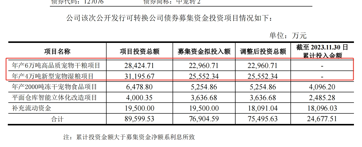 据了解,2022年10月,中宠股份发行了7.69亿元的可转债,资金主要用于上述两个项目以及年产2000吨冻干宠物食品项目、平面仓库智能立体化改造项目以及补充流动资金。