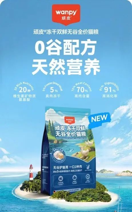 产品方面,wanpy顽皮?品牌坚持“创新”“关爱”“有趣”的产品创新理念,持续发挥主粮优势,旗下热门干粮产品“双鲜系列干粮”迎来重磅升级,多渠道持续热销。不仅如此,wanpy顽皮?旗下多款经典产品也迎来了主食方向新升级。在畅销爆品的基础上,wanpy顽皮?品牌推出了 8 倍优质高蛋白的欧一吸多肉芝士全价主食猫条、生骨肉好消化的生命粒全价主食鲜封包,还重磅上新了“1根猫条=2颗鱼油”的欧一吸冰岛鱼油全价主食猫条,进一步展现了wanpy顽皮?品牌在宠物食品领域的强大创新力,一经上市深受消费市场好评。