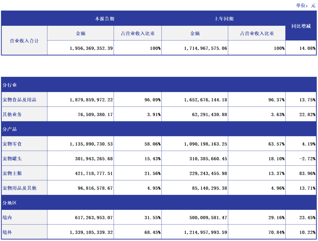 2024年上半年,公司境内主营业务收入6.17亿元,同比增长23.45%。境外主营业务收入13.39亿元,同比增长10.22%。整体来看,宠物主粮贡献销售额为4.22亿元,同比增长83.96%。