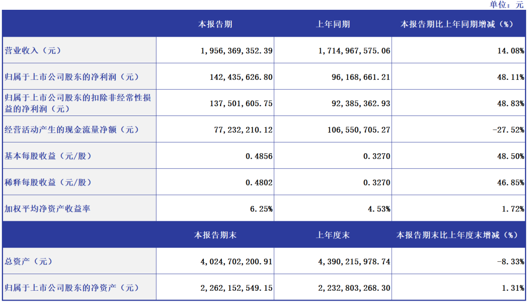 报告期内,公司实现营业收入19.56亿元,同比增长14.08%;归属于上市公司股东的净利润为1.42亿元,同比增长48.11%。2024年第二季度的营收和净利润均达到了公司上市以来的最高季度水平。
