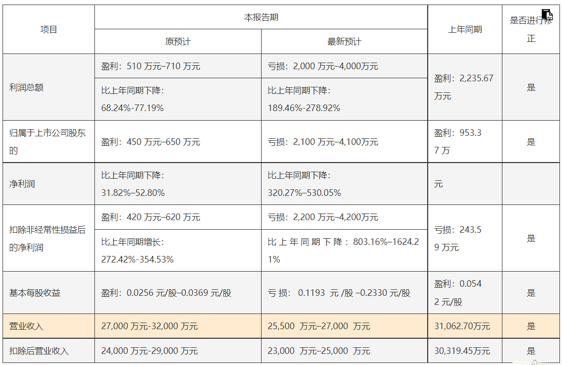 然而,3月15日的修正公告中,公司归母净利润从预盈转为亏损2100万元至4100万元,扣非净利润亏损2200万元至4200万元。