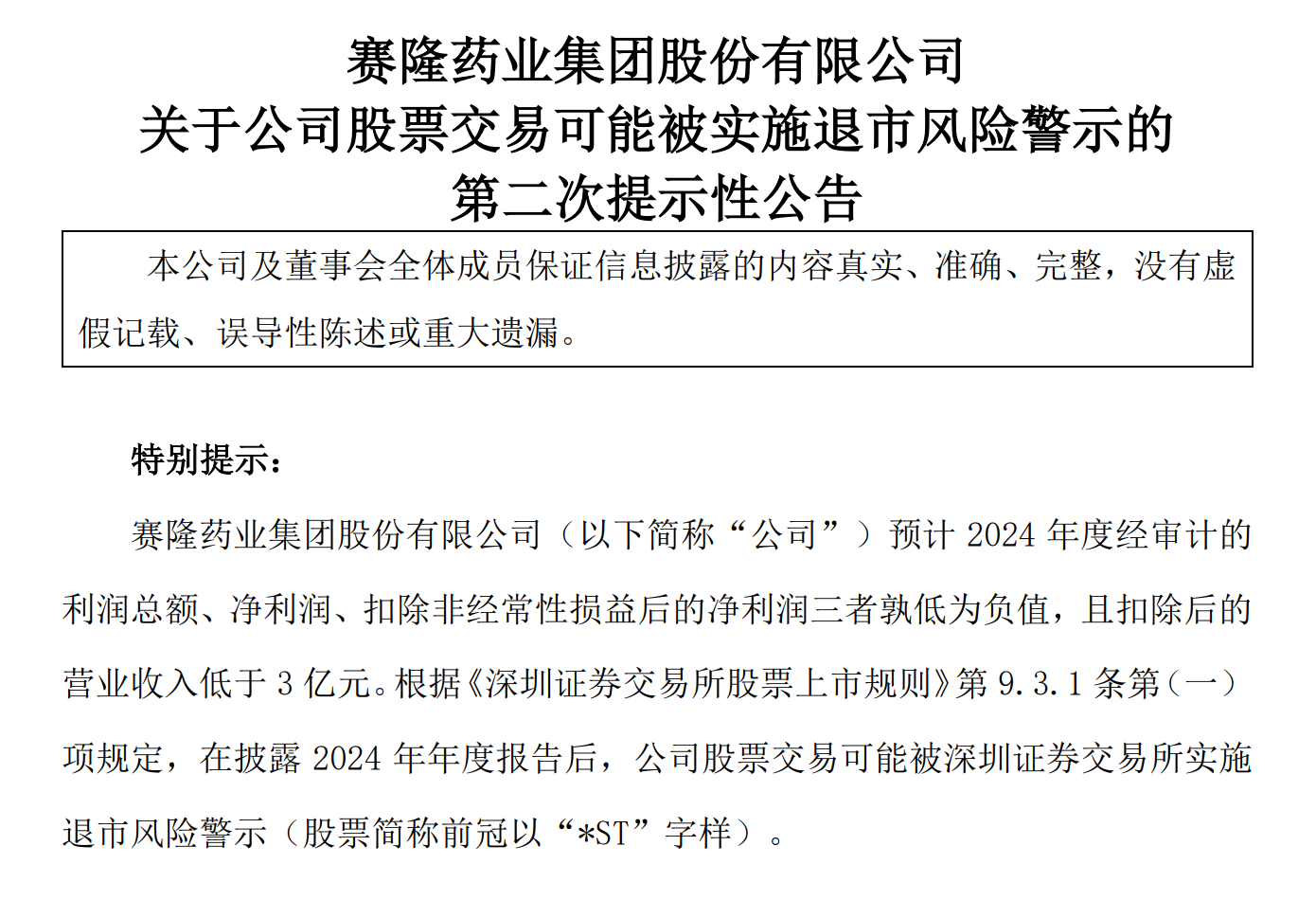 4月4日,赛隆药业发布公司股票交易可能被实施退市风险警示的第二次提示性公告,公告披露,该公司预计2024年度经审计的利润总额、净利润、扣除非经常性损益后的净利润三者孰低为负值,且扣除后的营业收入低于3亿元。根据《深圳证券交易所股票上市规则》第9.3.1条第(一)项规定,在披露2024年年度报告后,公司股票交易可能被深圳证券交易所实施退市风险警示(股票简称前冠以“*ST”字样)。