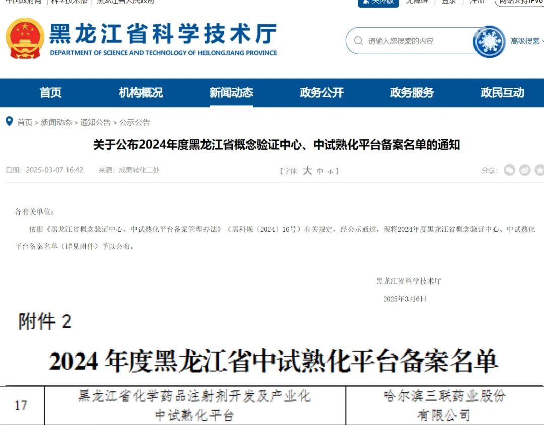 近日,黑龙江省科技厅公布《2024年度黑龙江省概念验证中心、中试熟化平台备案名单》,哈三联作为黑龙江省化学药品注射剂开发及产业化中试熟化平台成功入选,成为省内首批中试熟化平台。