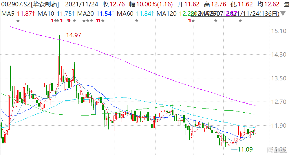 华森制药(002907.SZ)封涨停板,报12.76元,股价创今年7月以来新高,市值51亿元。近日,工信部发出《关于公布2021年国家技术创新示范企业名单的通知》显示,全国有58家企业被认定为2021年国家技术创新示范企业,华森制药上榜。