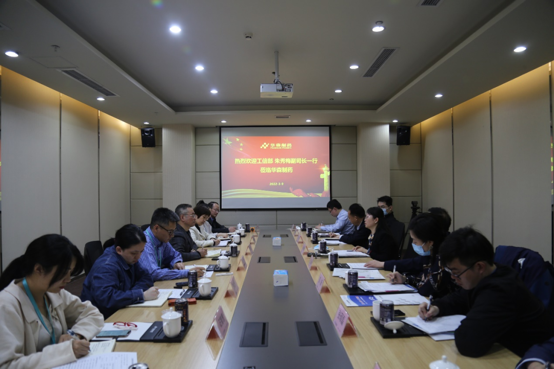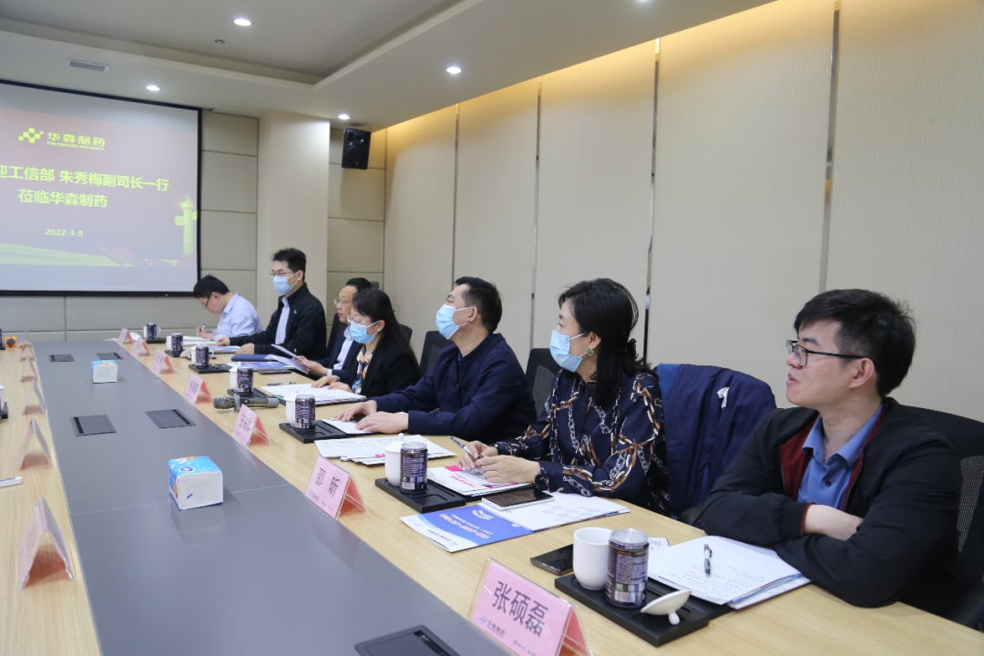 阳春三月, 3月9日,国家工信部人教司副司长朱秀梅带队,工信部人才工作处处长邵昕、工信部人才处四调余海龙、工信部人才处干部张硕磊、市经信委副主任王任林、干部处处长高明、干部处副处长杨明元、医药处副处长胡睿等一行领导深入华森制药走访,调研企业科技创新人才建设。公司党委书记、董事长游洪涛、总经理刘小英、副总经理游雪丹、副总经理、首席科学官 Yuxun Wang 博士、总经理助理 Yuanyi You、创新药药化负责人 Xiaohui Liu博士、人力资源部经理石智惠等公司领导给予了热情接待。