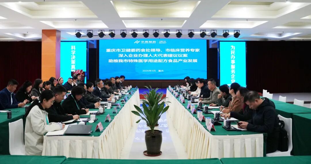 3月16日,重庆市卫生健康委员药政食品处处长沈鹏、一级调研员万维福带领重庆市临床营养专家团队,深入华森制药召开人大代表建议办理现场会,就市人大代表游洪涛在市六届人大三次会议上提出的《关于加快我市大健康特医食品和保健食品赛道布局的建议》进行面对面沟通与实地调研,旨在通过高质量办理人大代表建议,打通政策落地“最后一公里”,为我市特殊医学用途配方食品产业注入强劲动力。