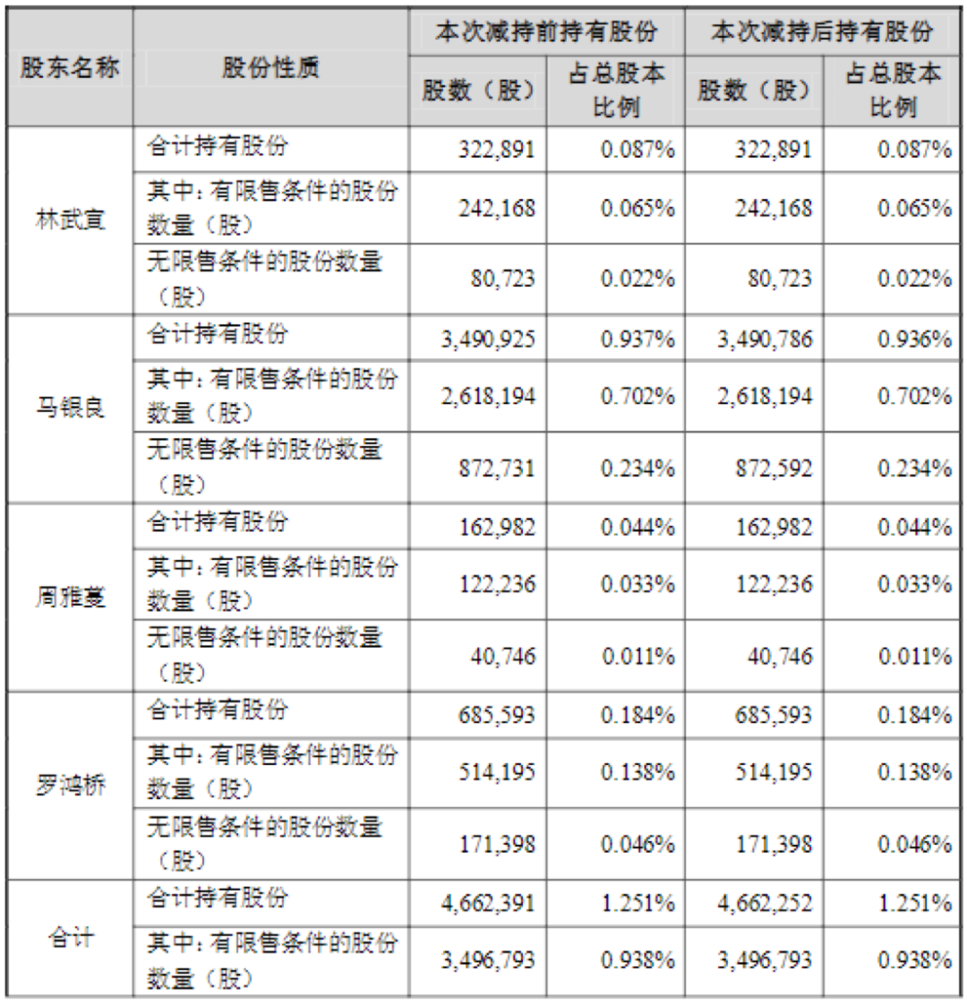 公告显示,截至2022年6月23日,马银良先生累计减持139股,占公司总股本0.00004%,股东林武宣先生、周雅蔓女士、罗鸿桥先生在本次减持计划期间内未减持所持公司股份。