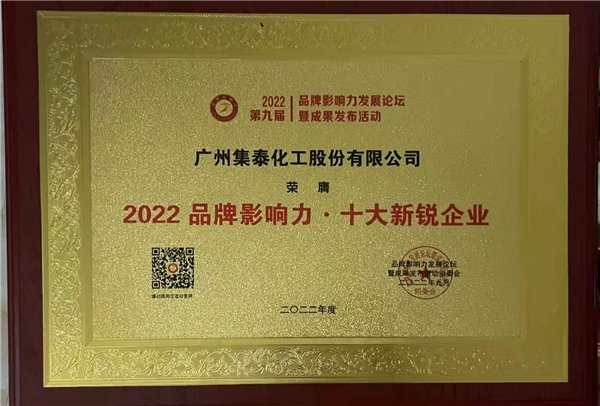 集泰股份凭借在密封胶行业及水性涂料行业的品牌影响力、服务力、创新力等方面的突出表现,作为第一批优秀案例,入选第九届品牌影响力发展论坛暨成果发布活动的《2022品牌影响力舆情监测成果报告》,荣获“2022品牌影响力.十大新锐品牌”、“2022品牌影响力100强”称号。