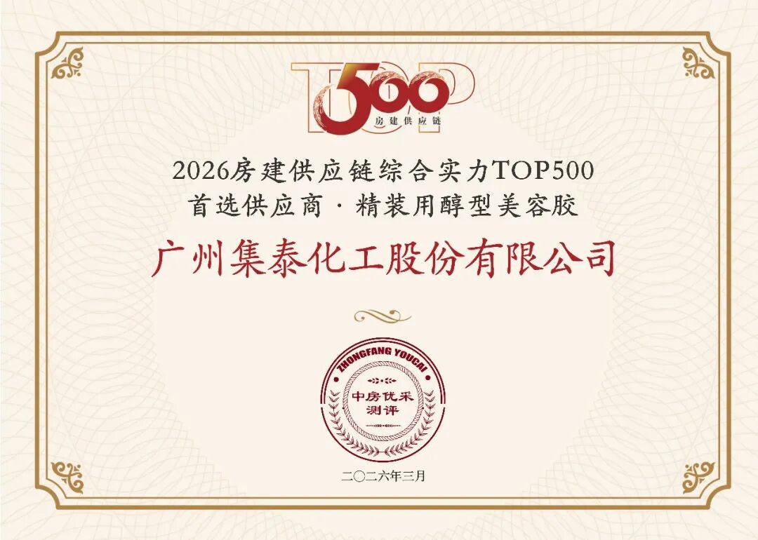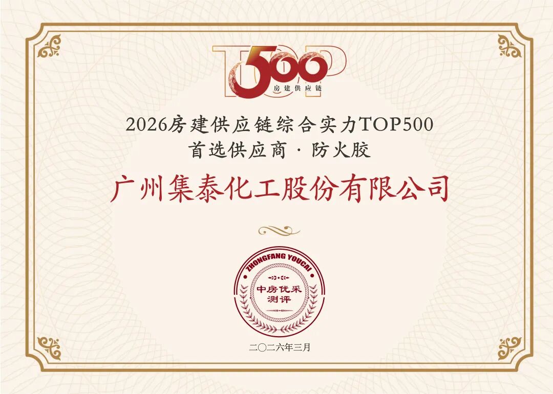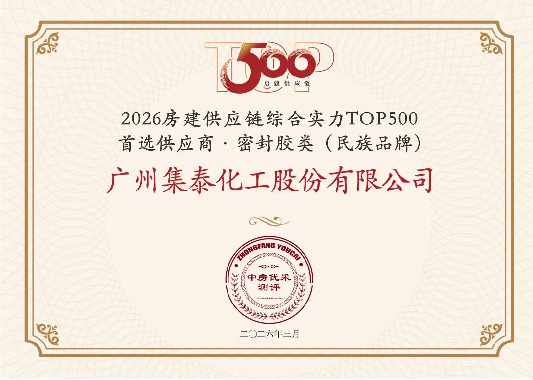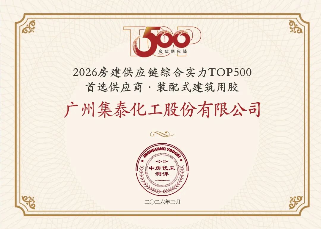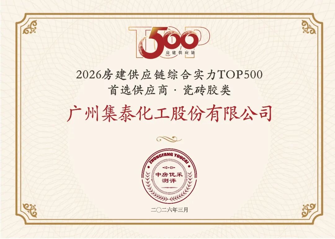 集泰股份携七大品类成功入选“2026房建供应链企业综合实力TOP500首选供应商”,以横扫之势再次印证其在建筑胶粘剂领域的头部地位。