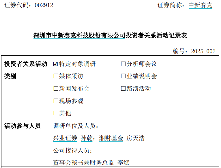 1月20日,上市公司中新赛克(002912.SZ)发布了《投资者关系活动记录表》,披露公司接待了兴业证券、湘财基金的调研,公司董事会秘书兼财务总监李斌参与,并解答投资机构代表提问。
