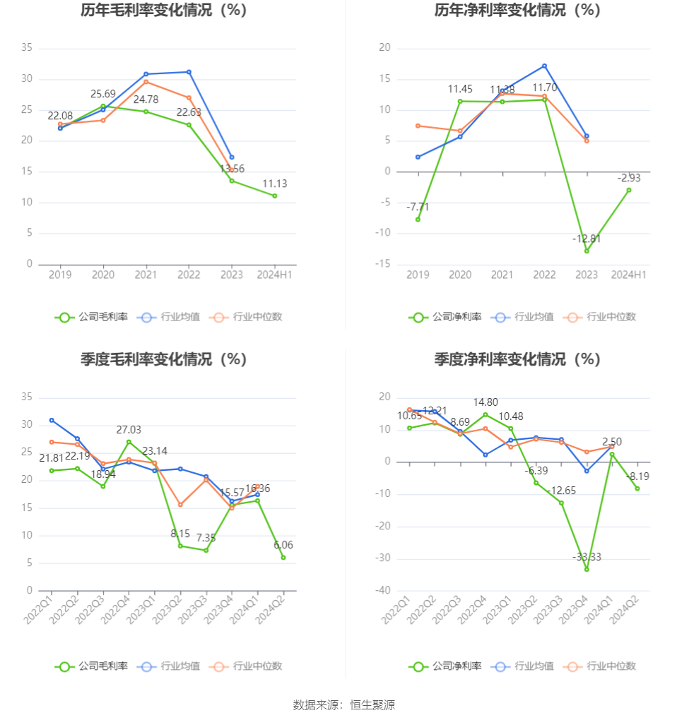 2024年上半年,公司毛利率为11.13%,同比下降4.51个百分点;净利率为-2.93%,较上年同期下降4.97个百分点。从单季度指标来看,2024年第二季度公司毛利率为6.06%,同比下降2.09个百分点,环比下降10.30个百分点;净利率为-8.19%,较上年同期下降1.80个百分点,较上一季度下降10.69个百分点。