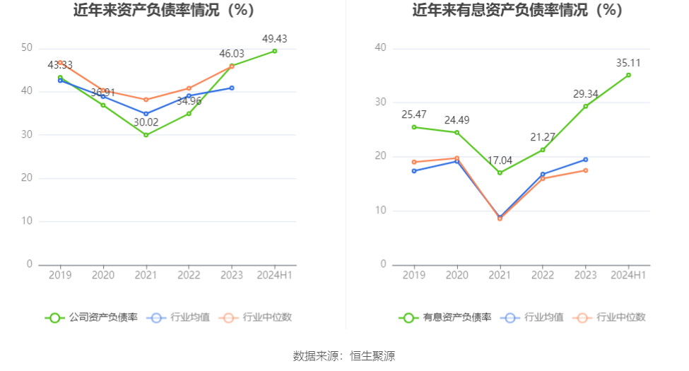 在偿债能力方面,公司2024年上半年末资产负债率为49.43%,相比上年末上升3.40个百分点;有息资产负债率为35.11%,相比上年末上升5.77个百分点。