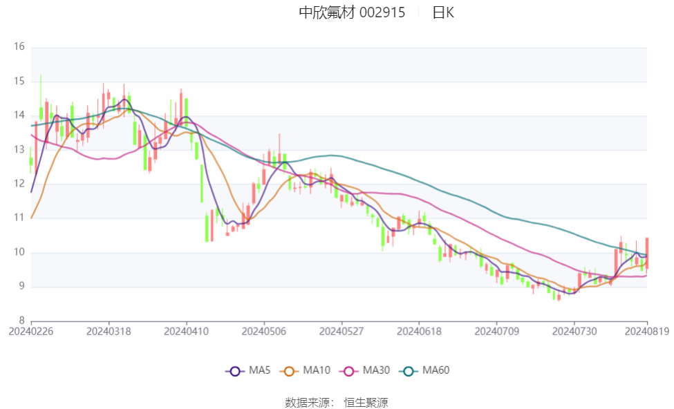 以8月19日收盘价计算,中欣氟材目前市盈率(TTM)约为-15.55倍,市净率(LF)约为2.32倍,市销率(TTM)约为2.42倍。