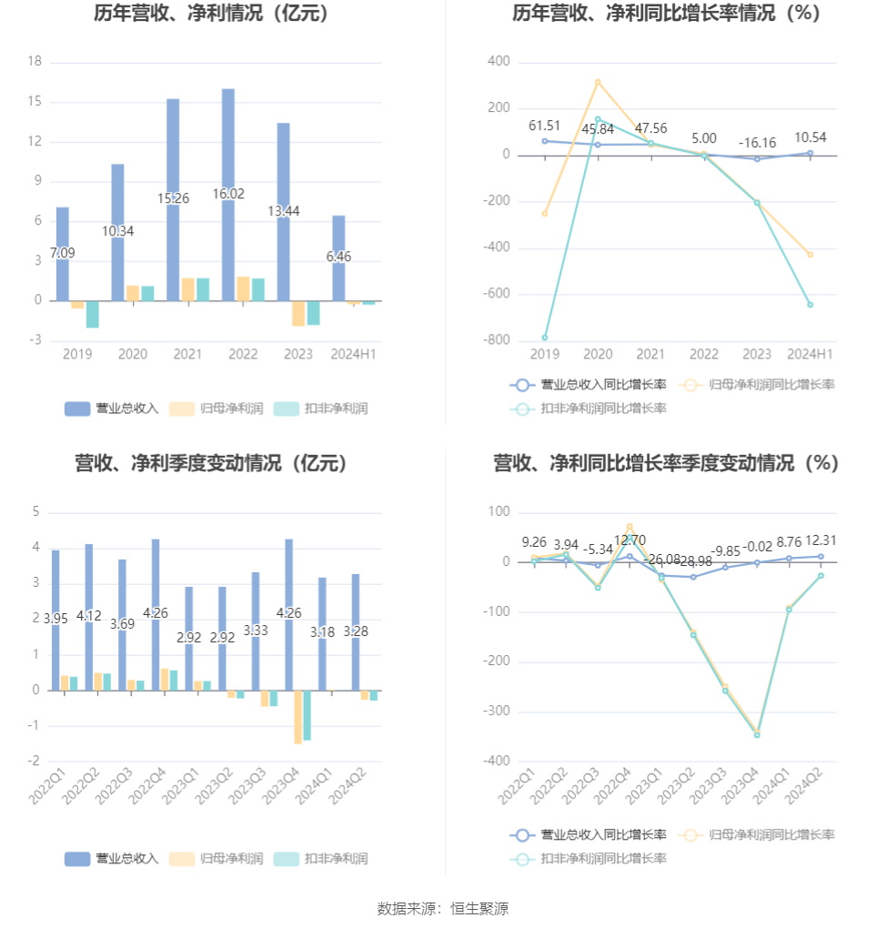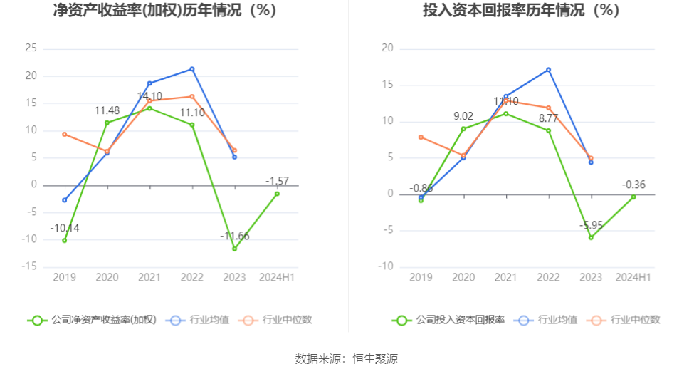 数据显示,2024年上半年公司加权平均净资产收益率为-1.57%,较上年同期下降1.93个百分点;公司2024年上半年投入资本回报率为-0.36%,较上年同期下降1.10个百分点。