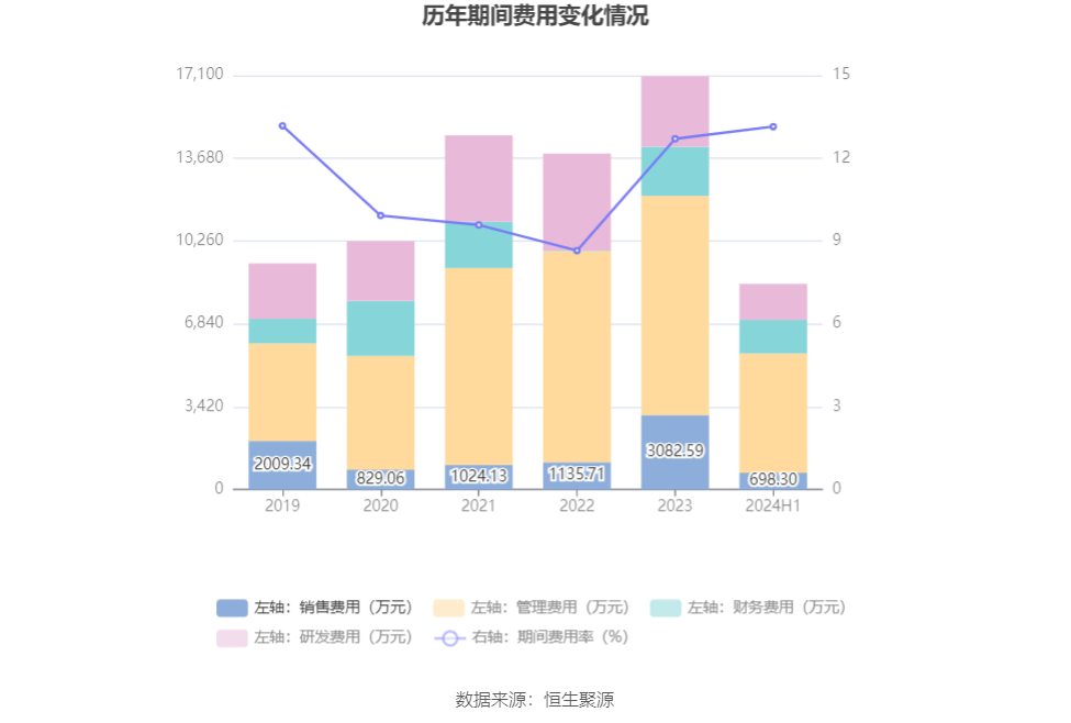2024年上半年,公司期间费用为8497.84万元,较上年同期增加1416.66万元;期间费用率为13.15%,较上年同期上升1.04个百分点。其中,销售费用同比下降15.79%,管理费用同比增长8.51%,研发费用同比增长27.9%,财务费用同比增长152.9%。