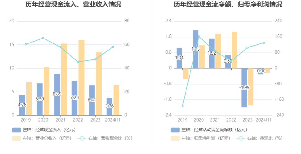 2024年上半年,公司经营活动现金流净额为-3010.07万元,同比增加9035.31万元,主要系销售商品、提供劳务收到的现金增加所致;筹资活动现金流净额2.26亿元,同比增加1.23亿元,主要系部分短期银行贷款变成长期贷款导致上半年偿还银行贷款债务支付的现金减少所致;投资活动现金流净额-1.55亿元,上年同期为-2.0亿元,主要系固定资产投资支付的现金减少所致。