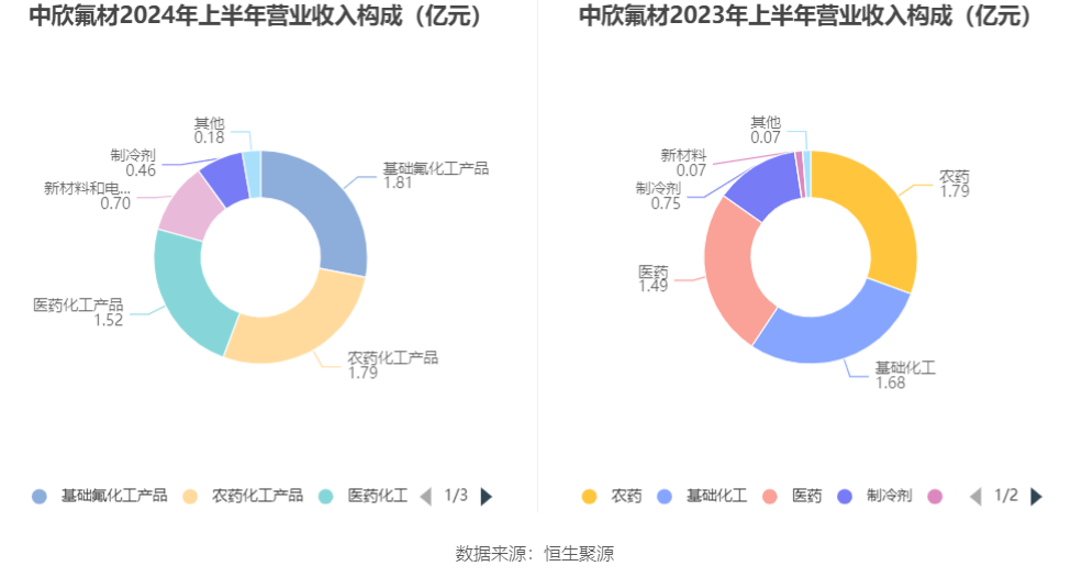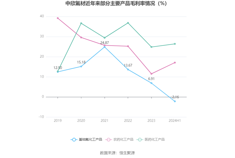 分产品看,基础氟化工产品、农药化工产品、医药化工产品2024年上半年毛利率分别为-2.16%、17.10%、26.41%。
