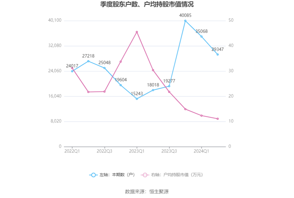 筹码集中度方面,截至2024年上半年末,公司股东总户数为2.93万户,较一季度末下降了5721户,降幅16.31%;户均持股市值由一季度末的12.36万元下降至11.12万元,降幅为10.03%。