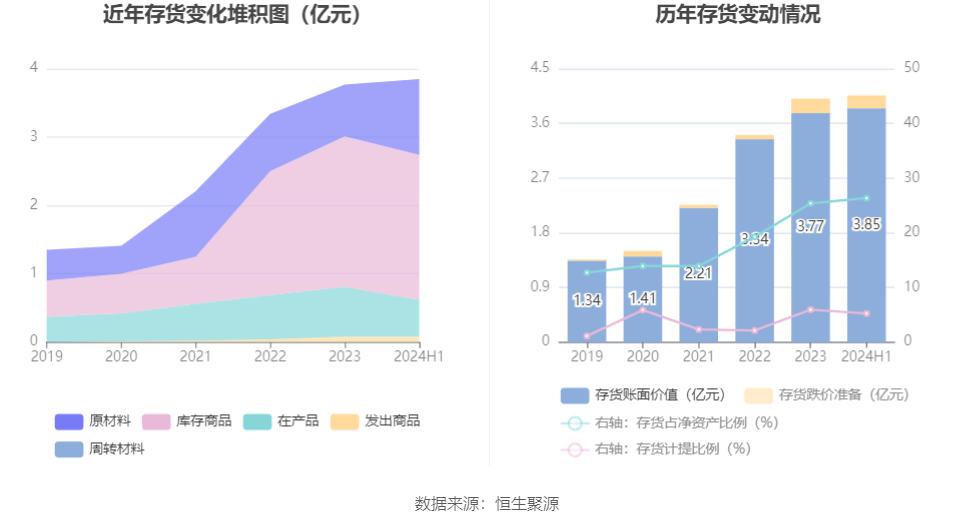 从存货变动来看,截至2024年上半年末,公司存货账面价值为3.85亿元,占净资产的26.33%,较上年末增加794.56万元。其中,存货跌价准备为2129.03万元,计提比例为5.24%。