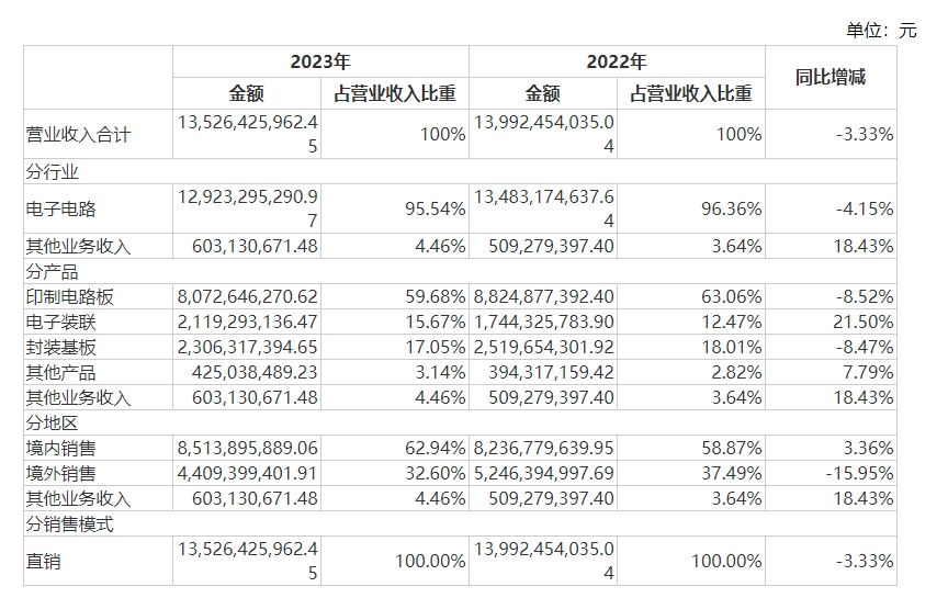 2023年,深南电路PCB业务实现收入80.73亿元,同比下降8.52%,占公司营业总收入的59.68%;毛利率26.55%,同比下降1.57个百分点。具体到应用领域方面,报告期内,公司通信领域订单整体规模同比有所下降。