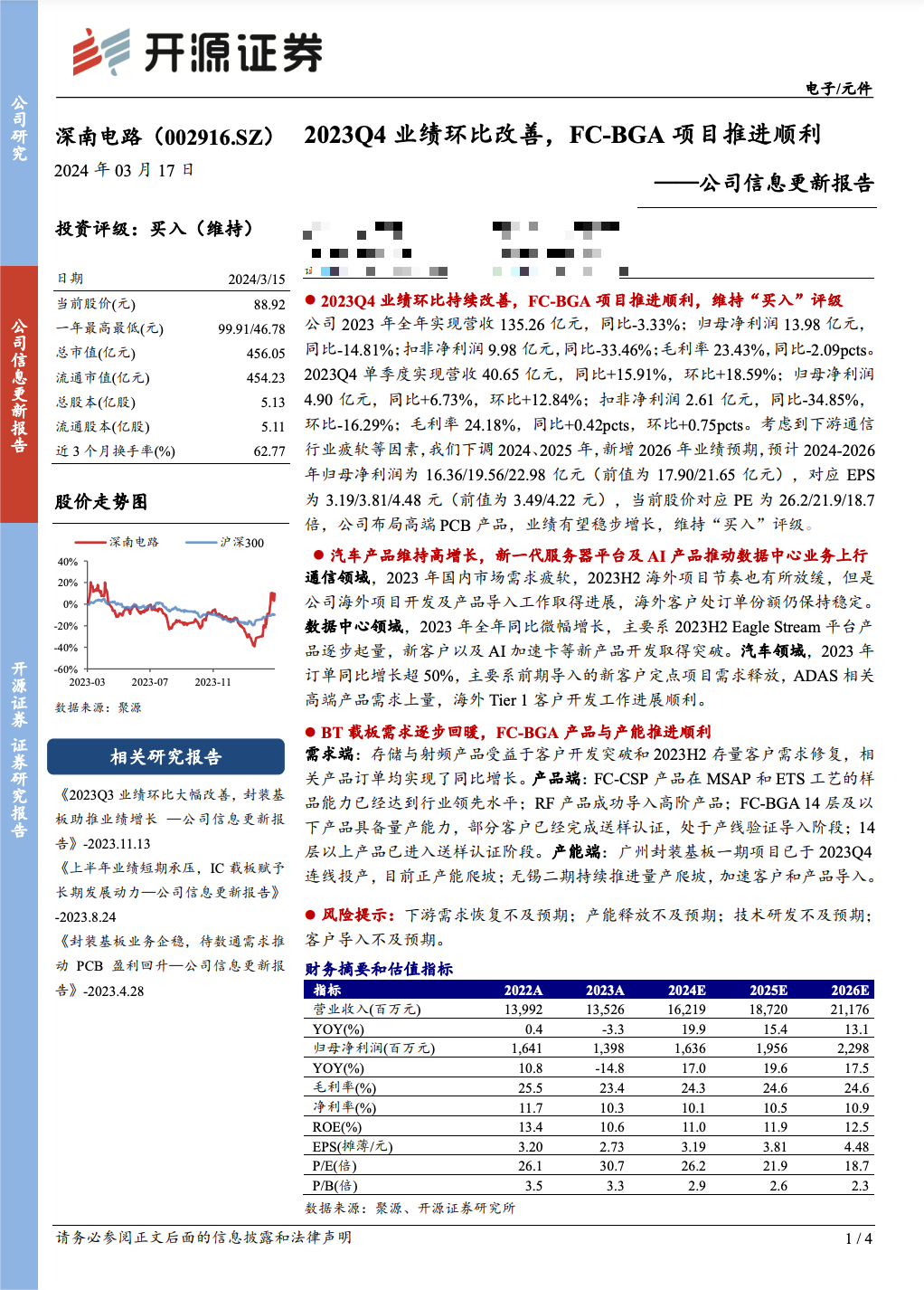 答:2023年下半年,公司把握行业需求的局部修复机会,盈利能力环比有所改善。公司在2023年下半年实现营业收入74.93亿元,环比增长24.2%,归母净利润9.24亿元,环比增长95%,扣非归母净利润5.72亿元,环比增长34.4%。上述变动主要得益于公司把握封装基板及PCB业务下游部分需求恢复的机会,整体稼动率较上半年有所提升,营收规模环比有所增长;同时,公司内部精益改善工作持续开展,运营能力获得进一步提升,助益毛利率环比增长。此外,公司在本期内收到部分政府补助款项,助益归母净利润环比增长。