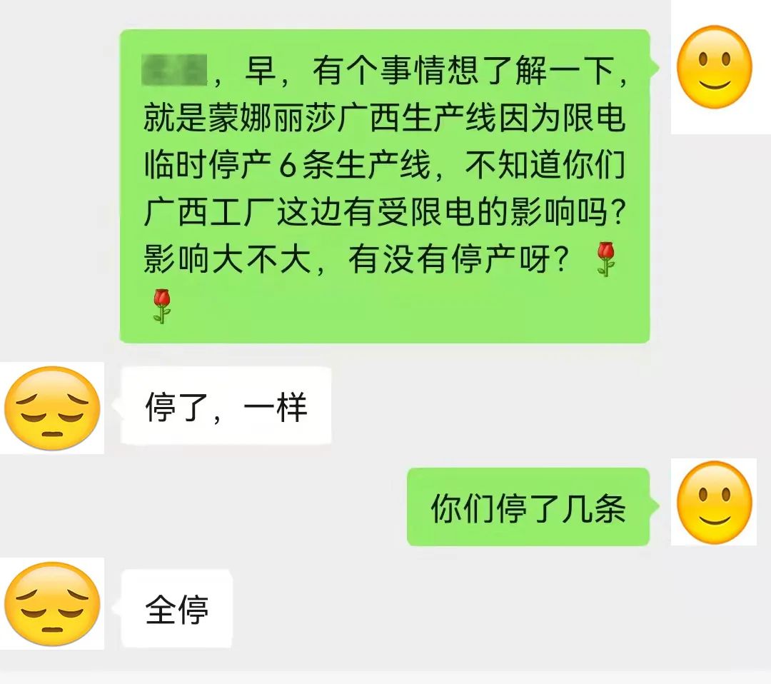 9月14日,蒙娜丽莎发布公告称,由于电力供应紧张,广西近日对辖区内建筑陶瓷等行业实行限电限产。受此影响,广西蒙娜丽莎新材料有限公司(桂蒙公司)供用电总负荷大幅降低,近日被迫临时停产6条生产线(建筑陶瓷日产能合计约15万㎡),剩余的1条生产线(建筑陶瓷日产能约2.5万平方米)也处于低负荷非正常运行状态,并可能面临停产。