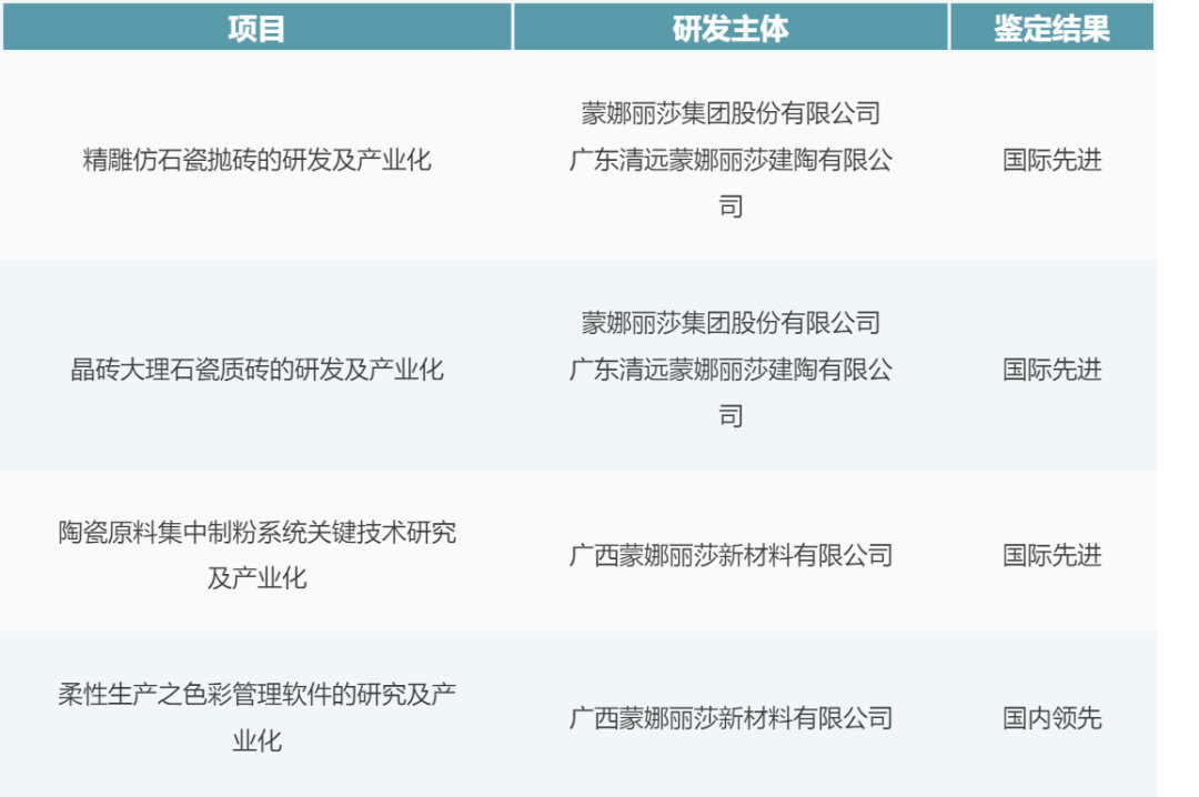 由蒙娜丽莎集团股份有限公司与广东清远蒙娜丽莎建陶有限公司联合研发的“精雕仿石瓷抛砖的研发及产业化”与“晶砖大理石瓷质砖的研发及产业化”两项项目被评定为“国际先进”。